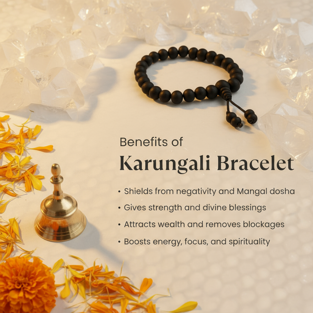 Begin wearing the Karungali Bracelet on Tuesday—the day ruled by Mars (Mangal). This timing helps neutralize negative Mars effects and amplifies the protective energy of Lord Murugan for maximum spiritual benefits.