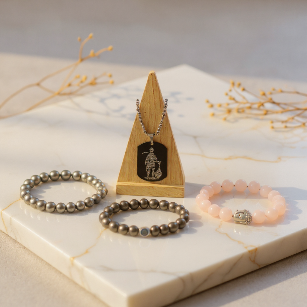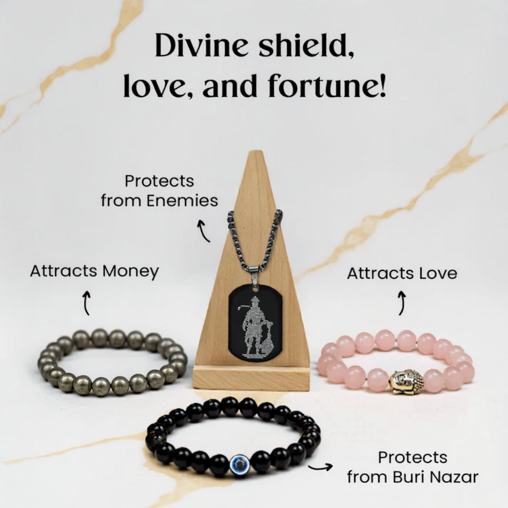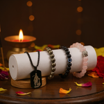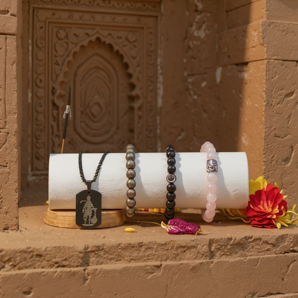 Elevate daily intention with the Raj Yog Combo — a thoughtfully curated set aligned with themes of prosperity, love, courage, and protective presence. This combo includes the Hanuman Chalisa Pendant, Raw Pyrite Bracelet, Rose Quartz Bracelet, and Evil Eye Bracelet for versatile, everyday wear.