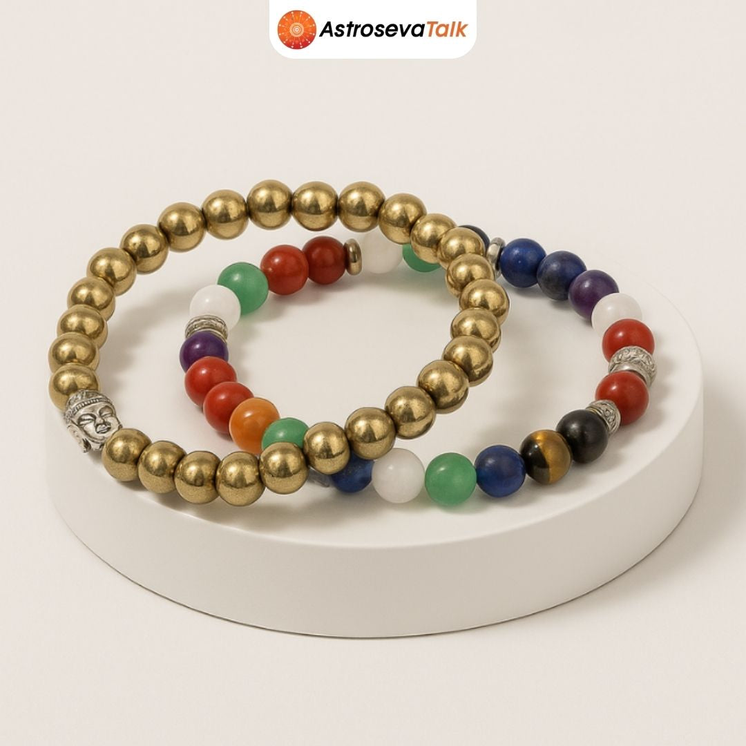 The Money & Vitality Combo pairs the Seven Chakra Bracelet for energy harmony with Golden Pyrite, often associated with abundance and success. Wear them to align your intentions with prosperity, confidence, and positive momentum.