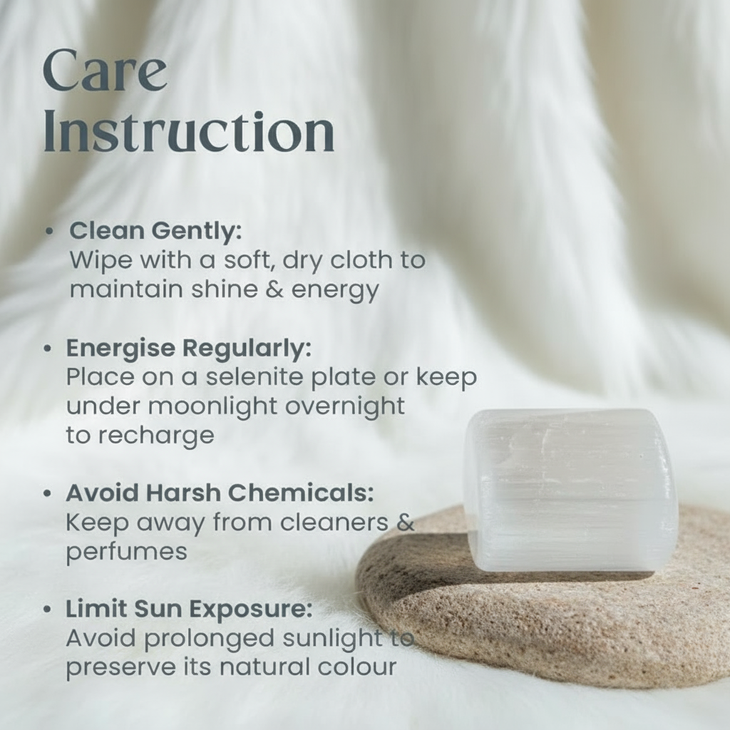 Selenite Tumble does not require traditional cleansing and can be re-energised by placing it on a clean cloth overnight while focusing on your intention for clarity protection and spiritual connection,