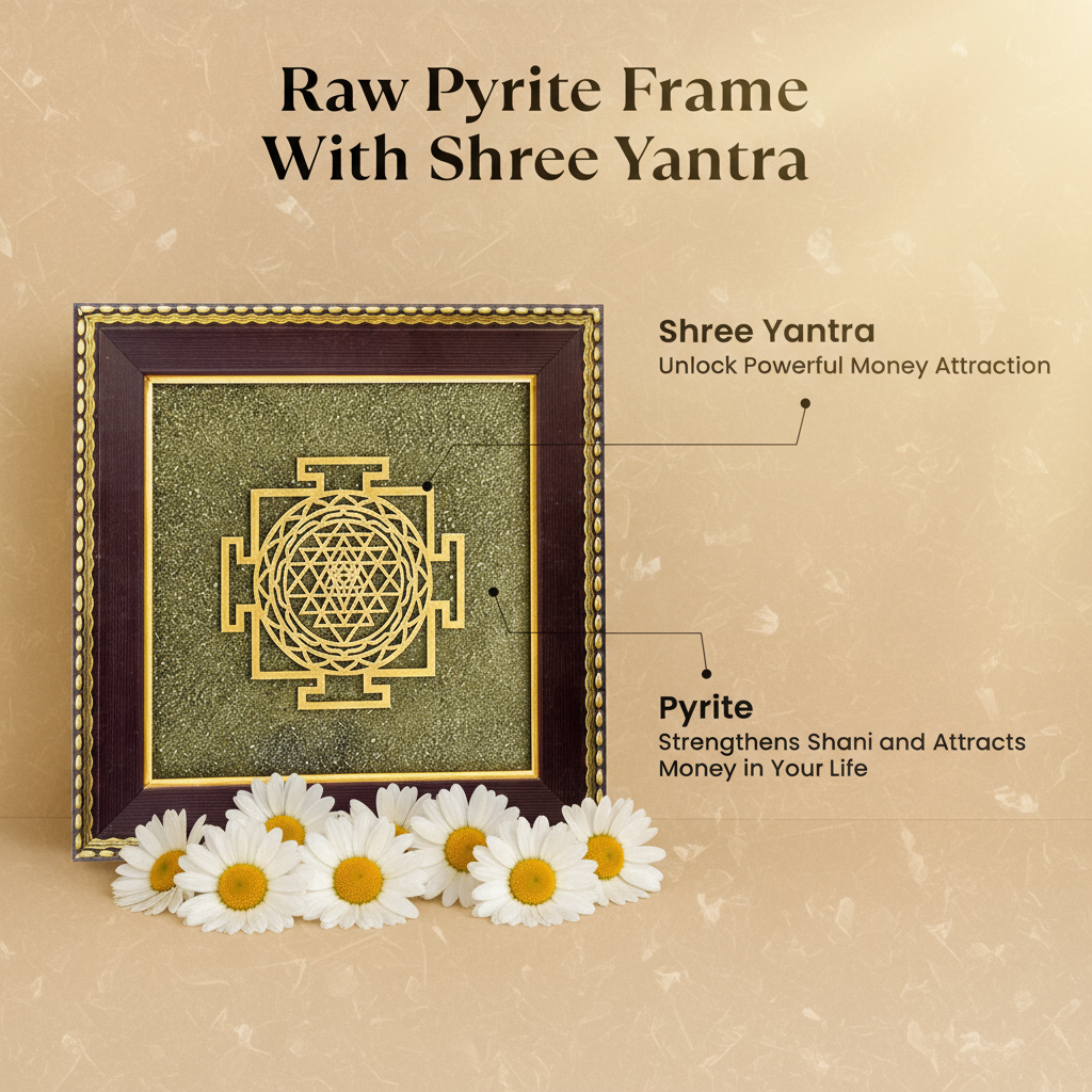 - Material: Shree Yantra (metal/printed) mounted on raw pyrite frame