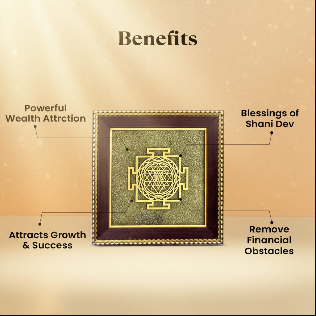 A powerful symbol of prosperity, wealth, and spiritual growth — the Shree Yantra (representing Goddess Lakshmi) is mounted on natural raw pyrite, the stone of wealth. This unique spiritual piece is handmade, with each frame bearing its own natural texture and finish.