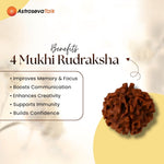 The 4 Mukhi Rudraksha is ruled by Lord Brahma and associated with the planet Mercury empowering the wearer with sharp intellect eloquence and mental clarity, it supports the throat chakra making it ideal for students teachers writers and those in communication or creative fields helping remove hesitation and strengthening expression and learning ability,
